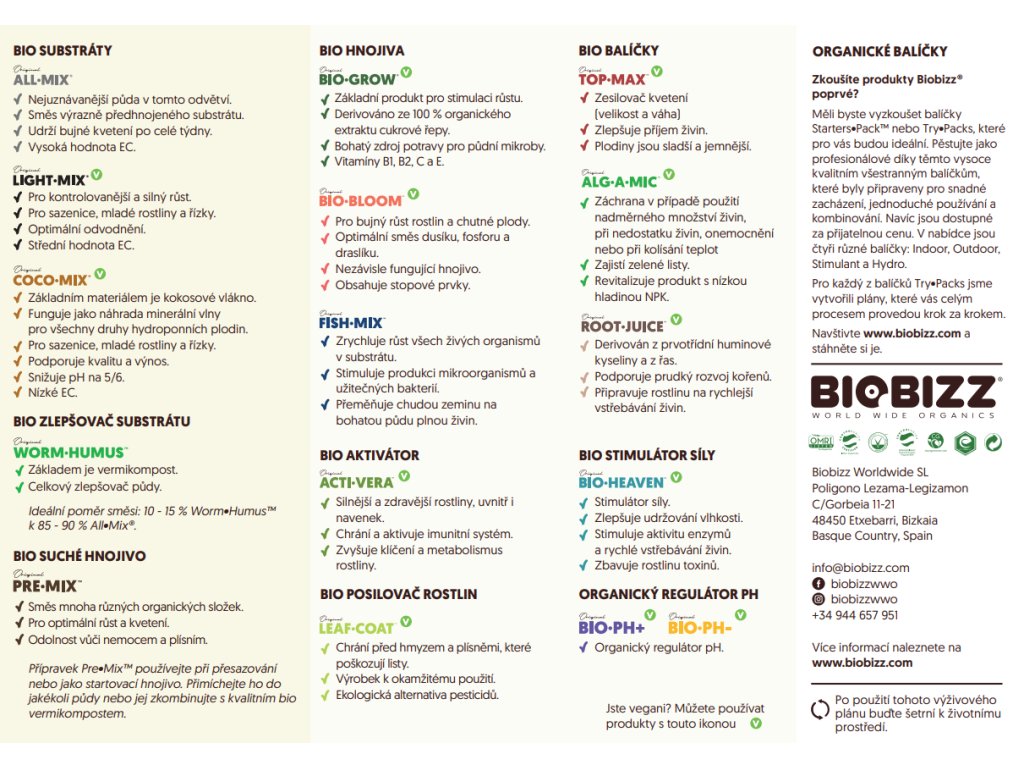 Tabulky BioBizz dávkování najdete v přiložených souborech. Namíchanou zálivku s organickými složkami spotřebujte do 24 hodin.