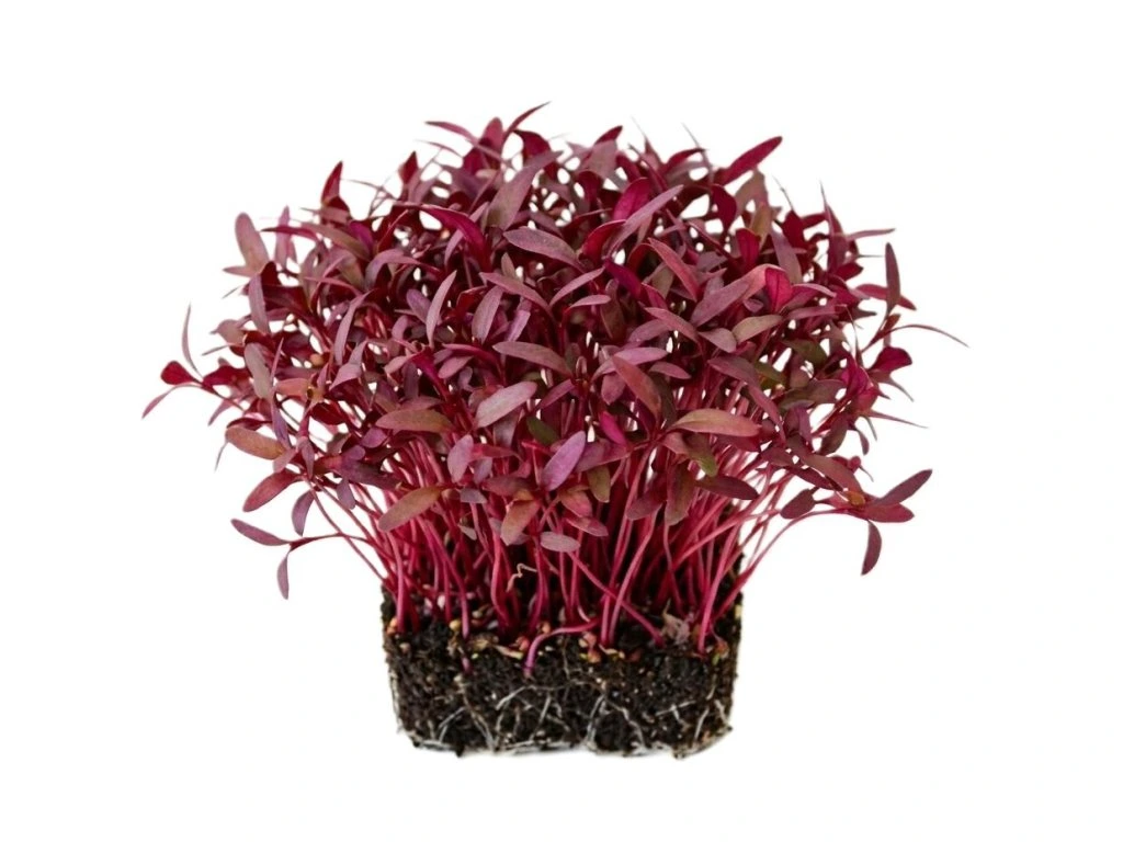 Červený amaranth jsou velice drobná, perleťově černá nebo bílá semínka. Pěstuje se snadno a rychle klíčí. Výhonky osahují jako ostatní microgreens mnoho vitamínů a minerálů, např. vápník, železo, draslík, fosfor, vitamín A a C. Obecně výhonky amaranthu pomáhají detoxikovat organismus, předcházet stárnutí, snižují krevní tlak a cholesterol a chrání kardiovaskulární zdraví. Výhonky obsahují betaniny. Červený amaranth má spíše zemitou chuť, není výrazný chuťově ale nahrazuje to plně vzhledem. Hodí se k dozdobení mnoha jídel. Amaranth pomáhá k regeneraci svalů.