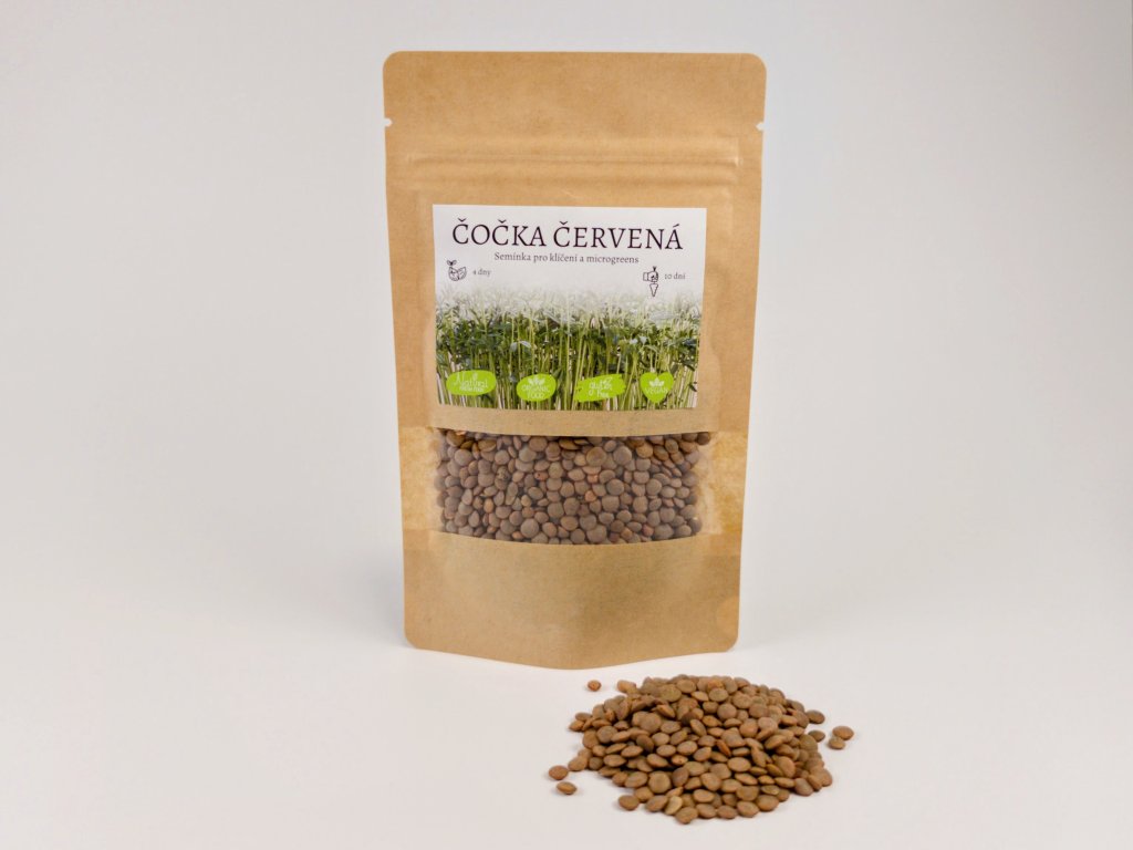 Semínka červené čočky vhodná pro domácí pěstování microgreens. Výhonky jsou bohaté na vitamíny a minerály, podporují trávení a imunitní systém. Ideální do salátů, polévek nebo jako ozdoba pokrmů.