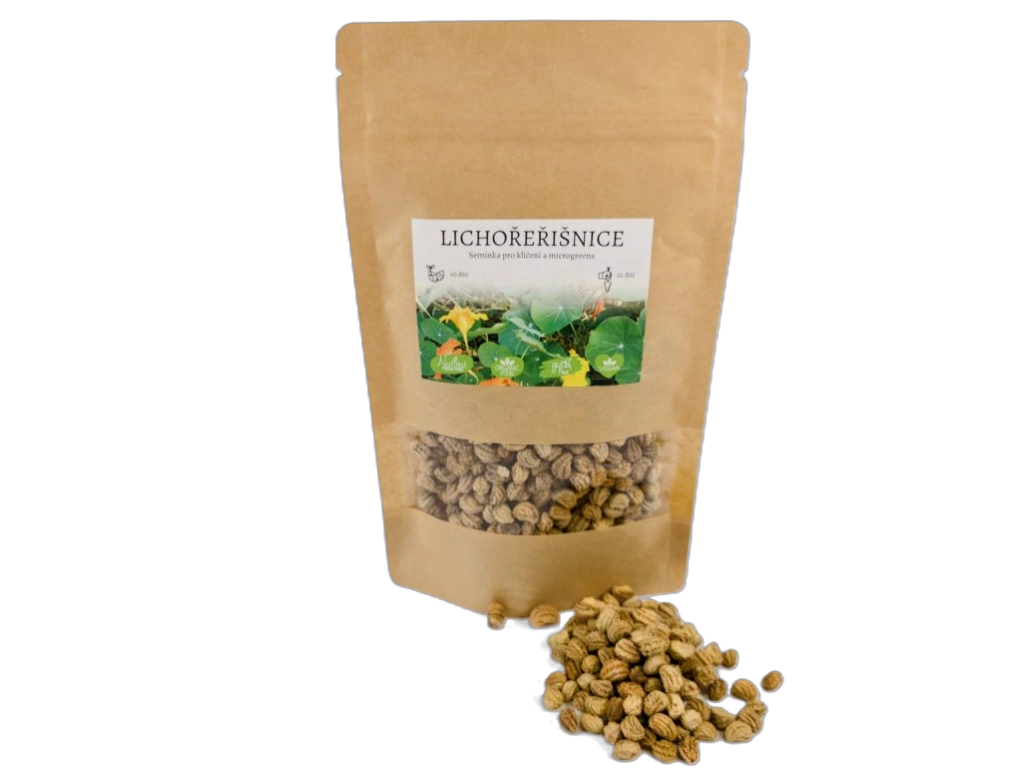 Lichořeřišnice (známá také jako nasturtium) je oblíbená odrůda semínek pro pěstování microgreens, která nabízí rychlý růst, pikantní chuť a vysoký obsah živin. Tyto malé výhonky mají ostrý, pepřový záhřev připomínající řeřichu nebo hořčici, jsou bohaté na vitamíny (A, C, K) a minerály (železo, vápník, draslík). Podporují imunitu, detoxikaci a mají protizánětlivé účinky díky obsahu glukosinolátů. Výhonky obsahují až 10x více antioxidantů než dospělá rostlina, pomáhají při trávení a celkovém posílení zdraví. Ideální pro syrovou konzumaci v salátech, sendvičích, smoothies nebo jako ozdoba jídel. Pěstování je jednoduché a celoroční, vhodné jak pro začátečníky tak i pro domácí zahrádky.